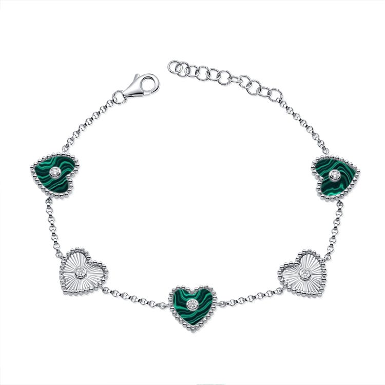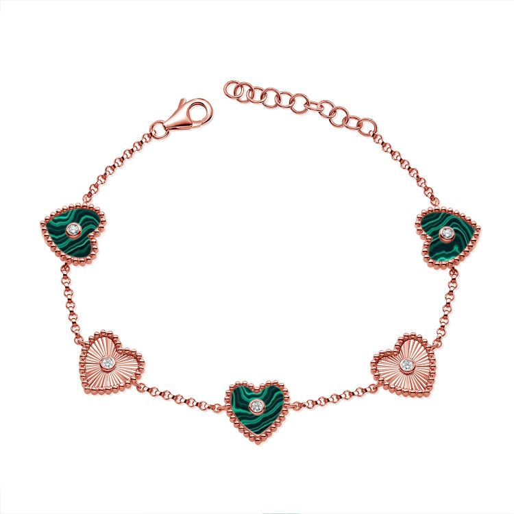 Our Malachite and Diamond Fluted Heart Chain Bracelet is so special, combining those stunning green malachite hearts with cool fluted metal hearts, and each one has a brilliant diamond – adding up to 1.7 carats of sparkle! It's bold, it's beautiful, and it's perfect for anyone who loves standout jewelry. You can choose it in classic yellow gold, pretty rose gold, or sleek white gold. Trust us, this one is going to be a new favorite!